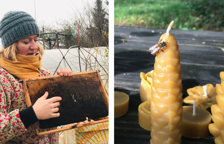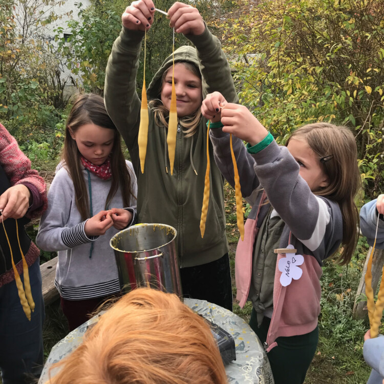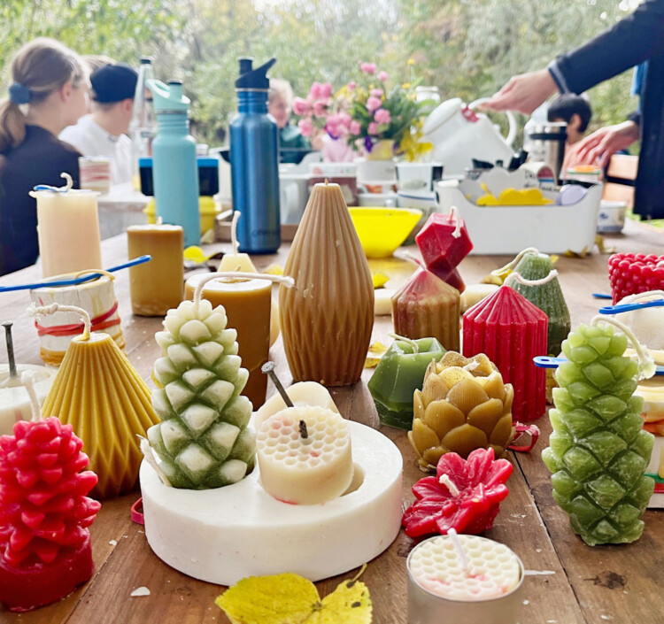 We start with the stories about the bees (German), where the wax comes from and how it can become a candle. Bees sweat the wax and use it to build their honeycombs for brood, pollen and honey. We harvest it and shape it into a candle, pour the hot wax into silicone moulds, let it cool, burn it and it gives light. Wohoo! We will try out how to mould candles in various shapes from this fragrant natural material. Candles can also be rolled out of wax sheets.